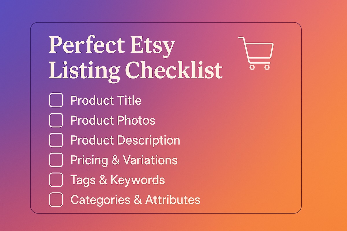 1. Product TitleInclude the main keyword phrase buyers would use to find your product.Avoid keyword stuffing - make it readable and natural.Front-load the most important keywords (first 40 characters are key for search).Be descriptive (e.g., “Handmade Silver Moon Necklace – Boho Jewellery for Women”).2. Photos & MediaAt least 7–10 high-quality images.First image is eye-catching and clearly shows the product.Include lifestyle shots (product in use).Show scale (e.g., next to a ruler or a hand).Detail shots for textures, finishes, or unique features.Include a short video showing the product ( ✨ use this free Motion tool to stand out and sell more)3. Product DescriptionHook in the first 1–2 sentences with a benefit or emotional appeal.Clearly describe the product’s features, size, materials, and variations.Mention use cases (e.g., gift ideas, occasions, target audience).Break up text into short paragraphs or bullet points for readability.Include a subtle call to action (e.g., “Order yours today to add a touch of charm to your home!”).4. Tags & KeywordsUse all 13 Etsy tags.Mix broad and specific keywords.Include synonyms and variations.Avoid repeating the same phrase in multiple tags.Research keywords using Etsy search suggestions or tools like eRank/Marmalead.5. Attributes & CategoriesSelect the most accurate category.Fill in all attribute options (color, size, material, style, holiday, occasion, etc.).Double-check that attributes align with target keywords.6. Pricing & ShippingCompetitive price for your niche.If possible, offer free shipping or build shipping cost into the price.Clearly display processing time and shipping methods.Include international shipping if it makes sense for your product.7. SEO & Search PlacementTitle, tags, and description all reinforce your main keywords.Keywords appear naturally in the first 160 characters of the description.No spelling errors or awkward phrasing that could hurt search visibility.8. Conversion BoostersHighlight unique selling points (e.g., handmade, eco-friendly, limited edition).Add urgency where genuine (e.g., “Only 3 left in stock”).Mention your shop’s guarantees (e.g., “Happiness Guaranteed or Your Money Back”).Use consistent branding across photos, descriptions, and shop policies.9. Final Review Before PublishingPreview listing on mobile—does it look appealing?Check for typos and grammar errors.Ensure all variations (color, size) work correctly.Test that shipping profiles are accurate.Confirm that all 13 tags are present.